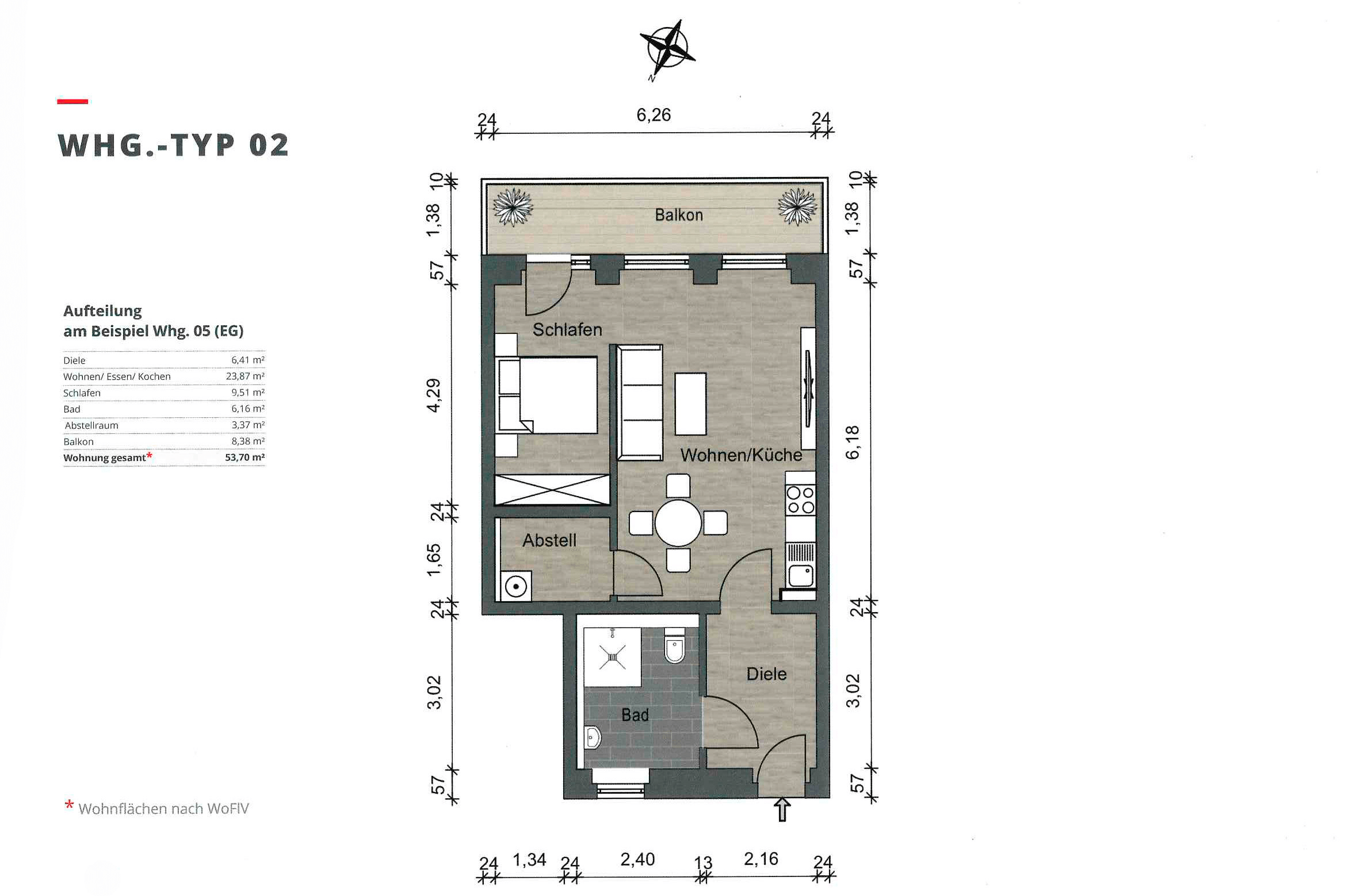 Die genauen Grundrisse und Größen finden Sie in der Anlage anhand der Wohnungsnummer / Typ Größe.